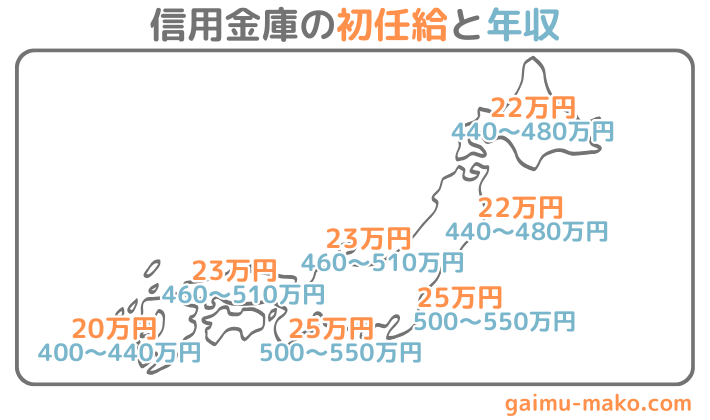 全体を把握するために、信用金庫自体の年収と、地域別の年収について把握しましょう。